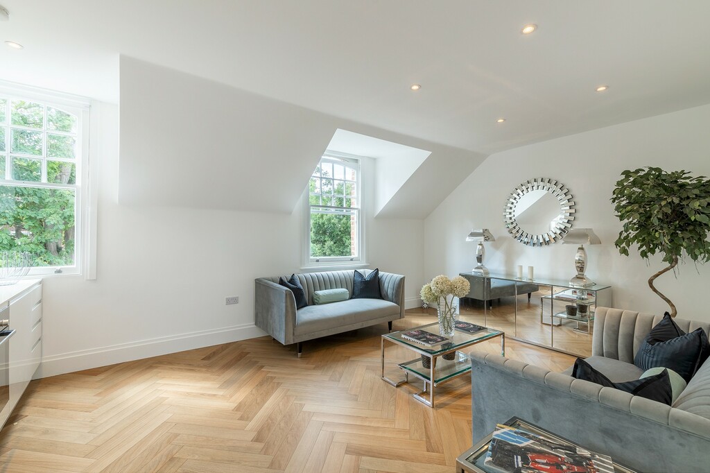 Bright open-plan reception room with bespoke flooring and ample natural light