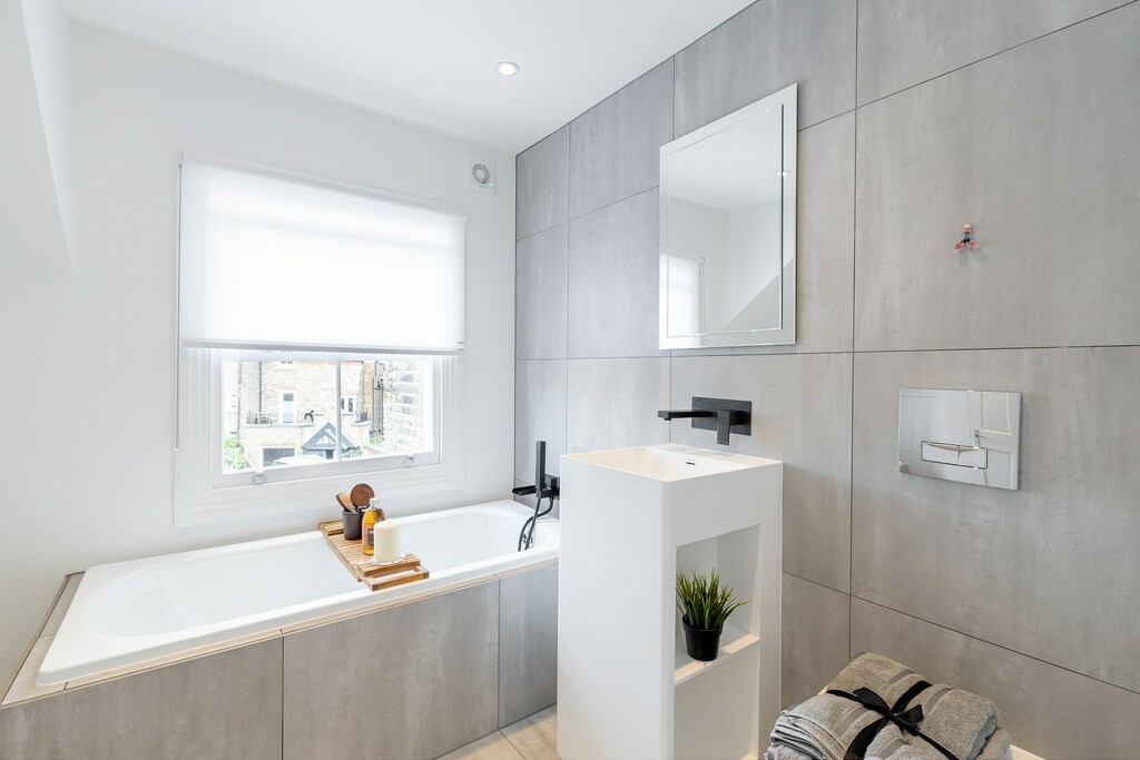 The spacious double bedroom offers a calm, contemporary feel, while the bathroom has been designed with luxurious, modern finishes, including a full-sized bathtub and chic tiled walls. Throughout, the apartment benefits from herringbone wood flooring, recessed lighting, and a fresh neutral décor.