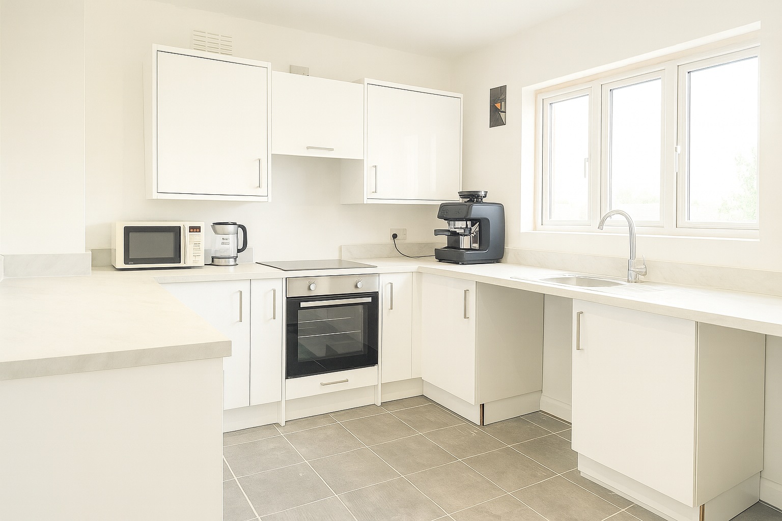 A newly fitted kitchen with modern units and worktops, complemented by a separate utility room for added convenience.
