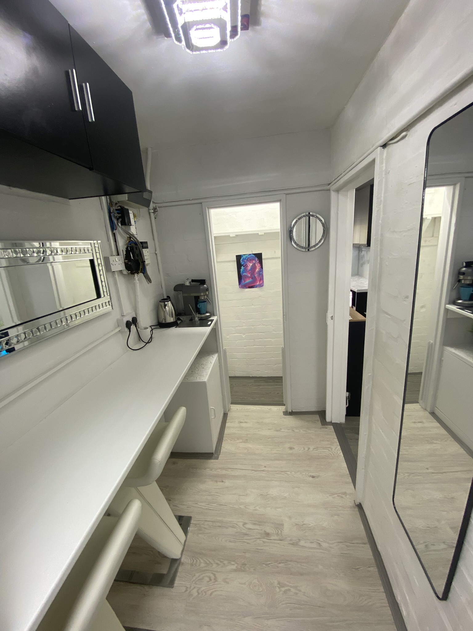 machine, drinks cooler/fridge, electric stove, radiator, cupboard housing gas boiler,