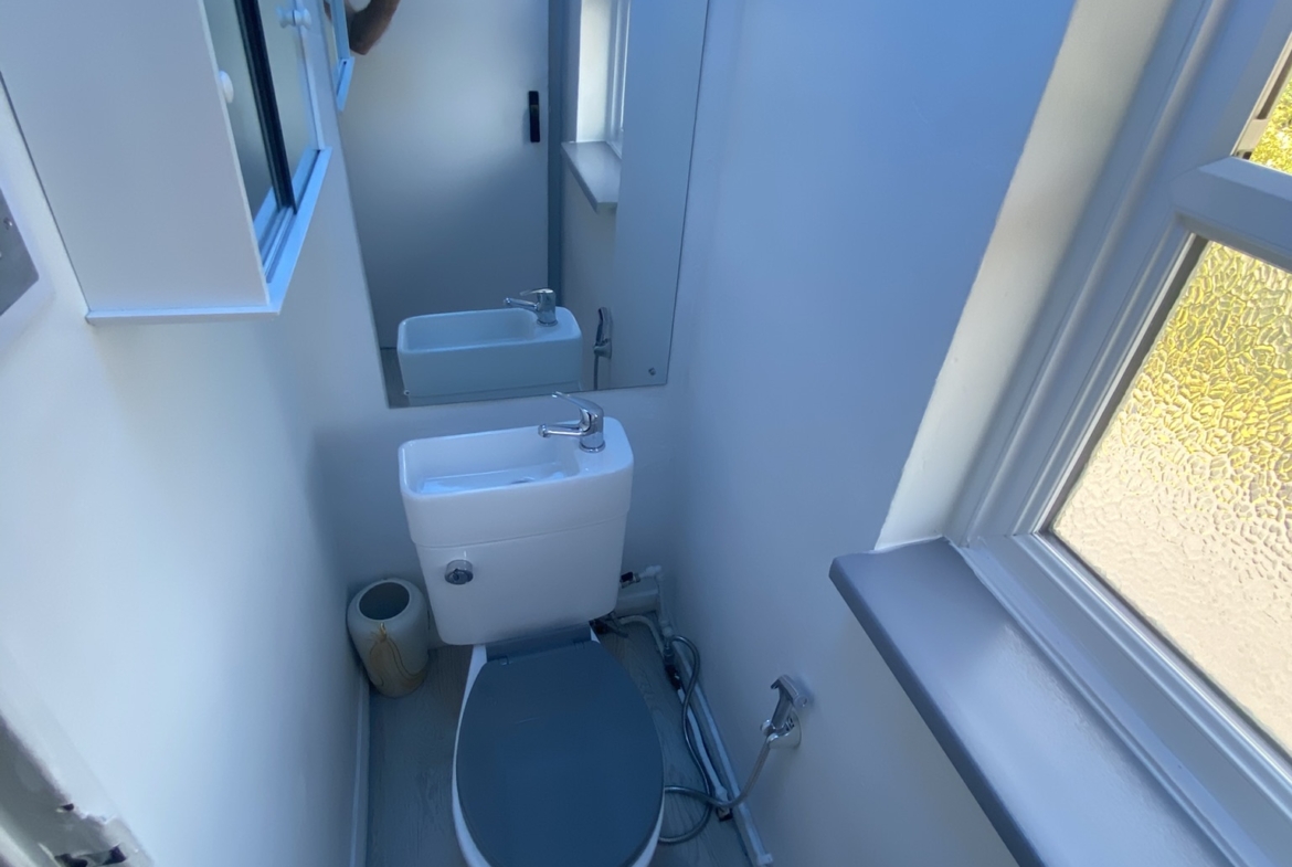 Rear aspect with frosted double glazed window with water saving sink over cistern.