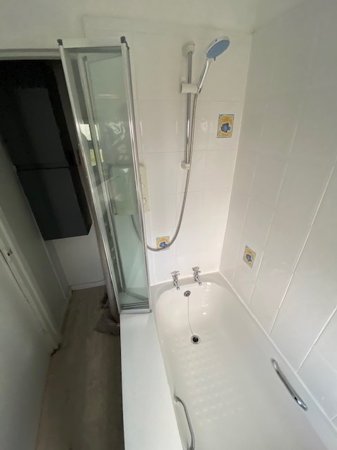 Rear aspect with frosted double glazed window, full sized bathtub with shower over, corner sink,