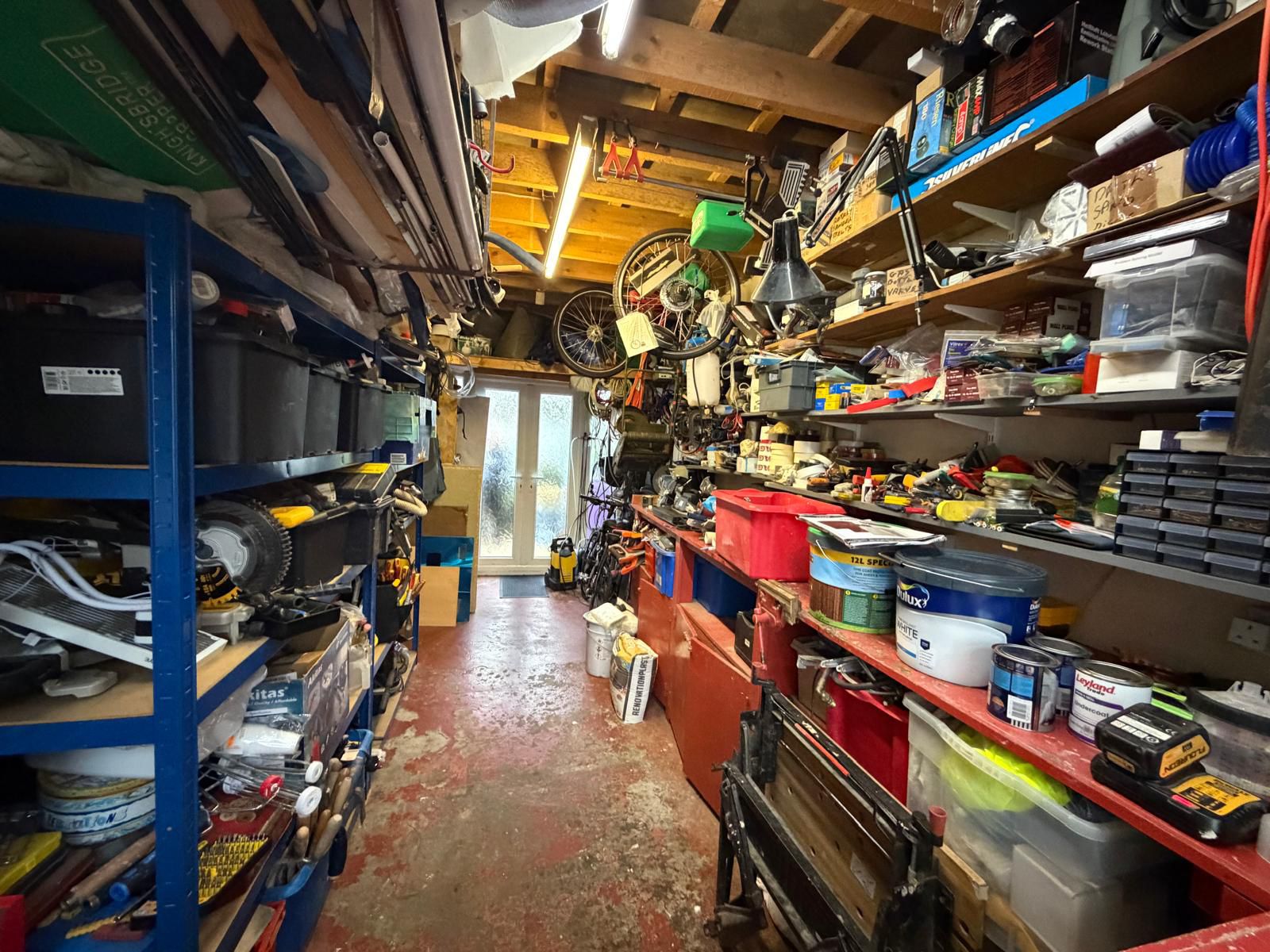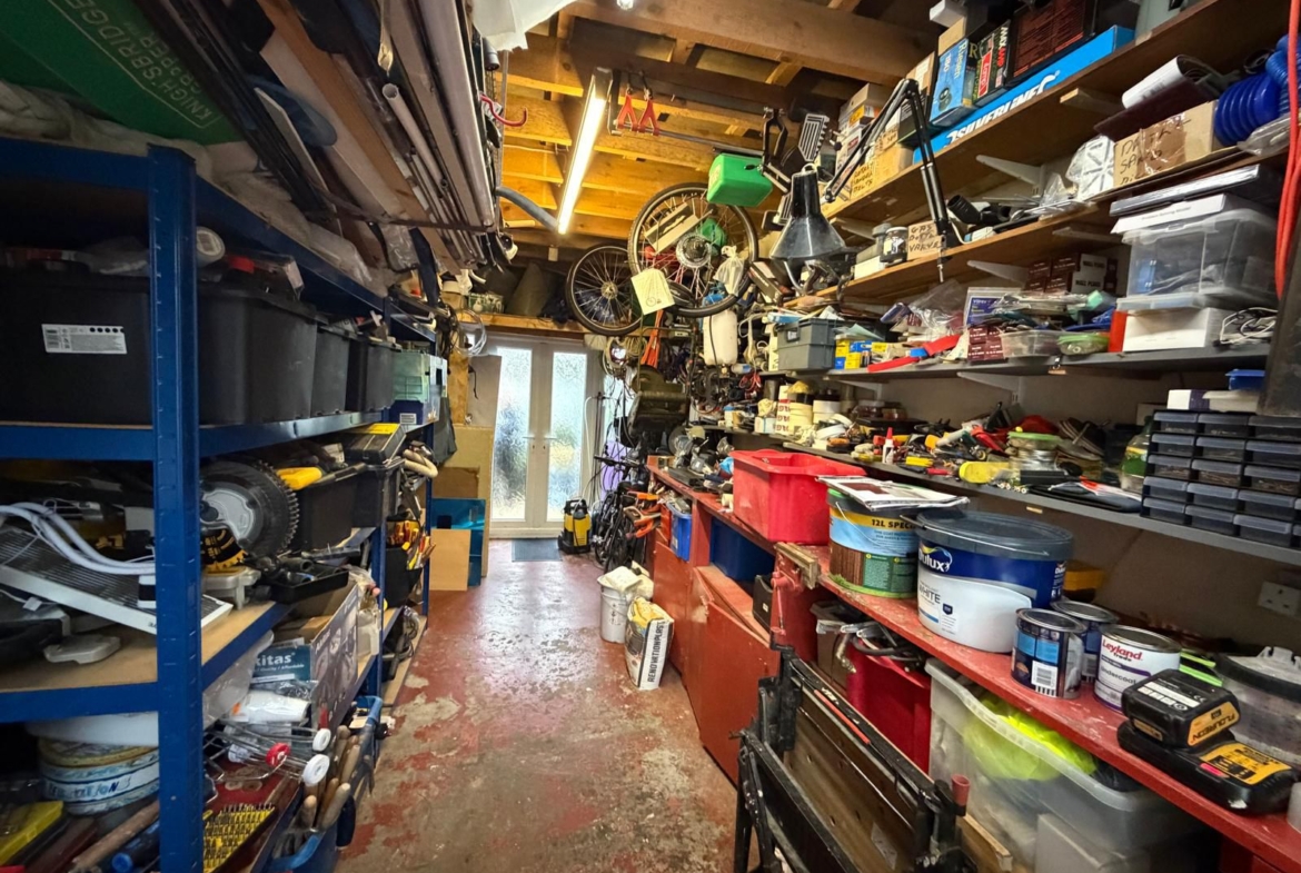 Garage/utility room – 5.97 x 2.61 (19’7” x 8’7”) – upvc French doors and windows to front aspect, upvc window and door to rear aspect, fitted tool storage cupboards and work bench, overhead ladder storage rack, wash hand basin, plumed out for washing machine and dryer.