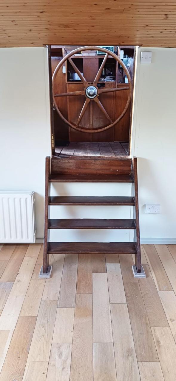 – Wheelhouse: this is the main entrance to the boat. Navigation equipment, access to engine room, steps down to living room in the former hold.