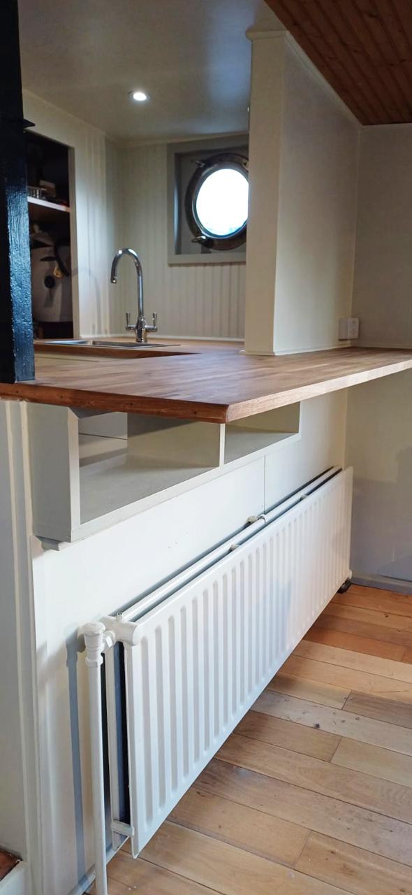 The boat features central heating, broadband, shore power, mains water, full headroom throughout (I’m 6’5”), and lots of space for a family. She’s been professionally renovated, with a new kitchen, updated bathroom and fully redecorated.