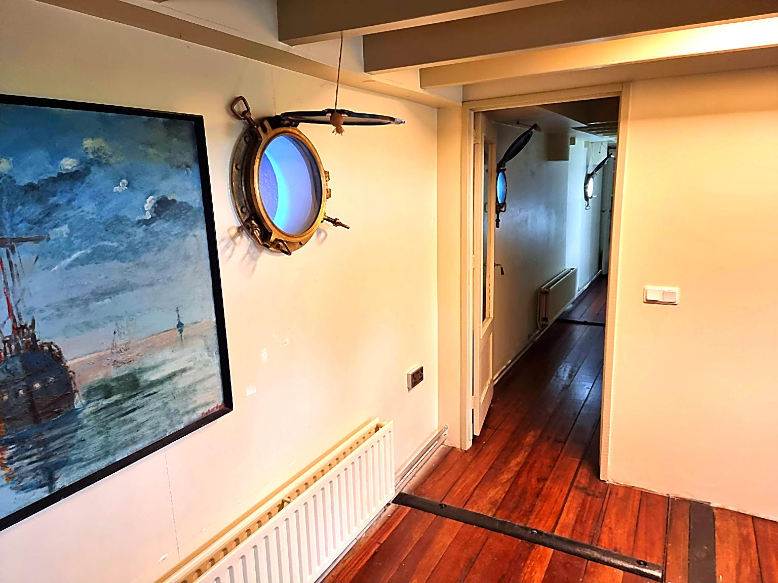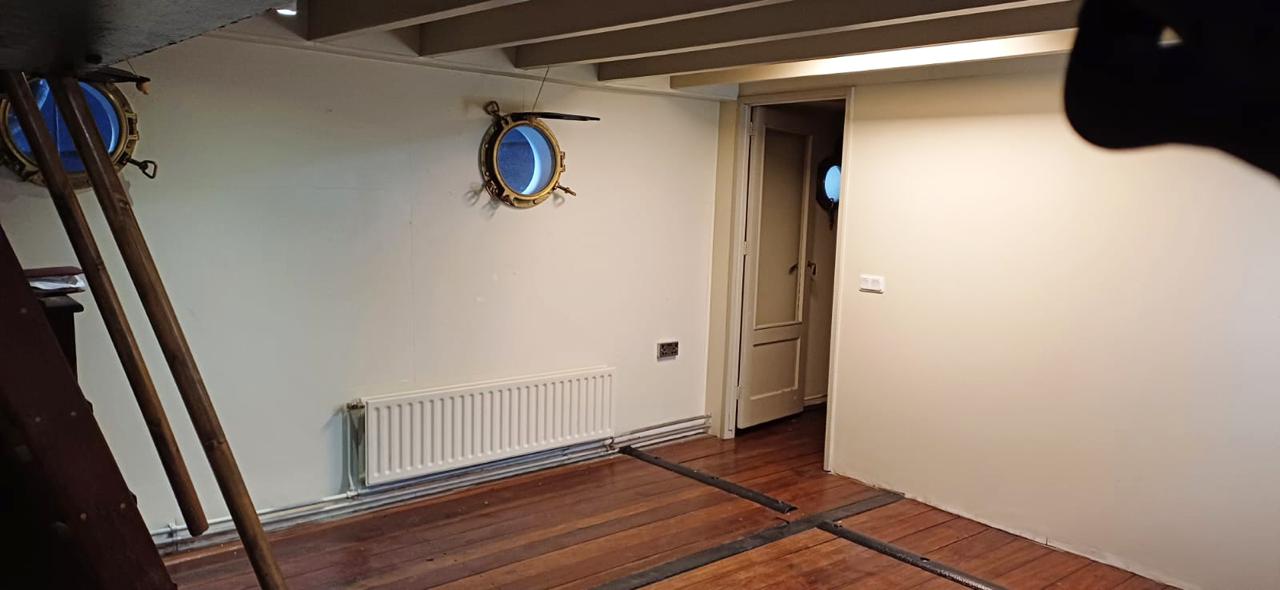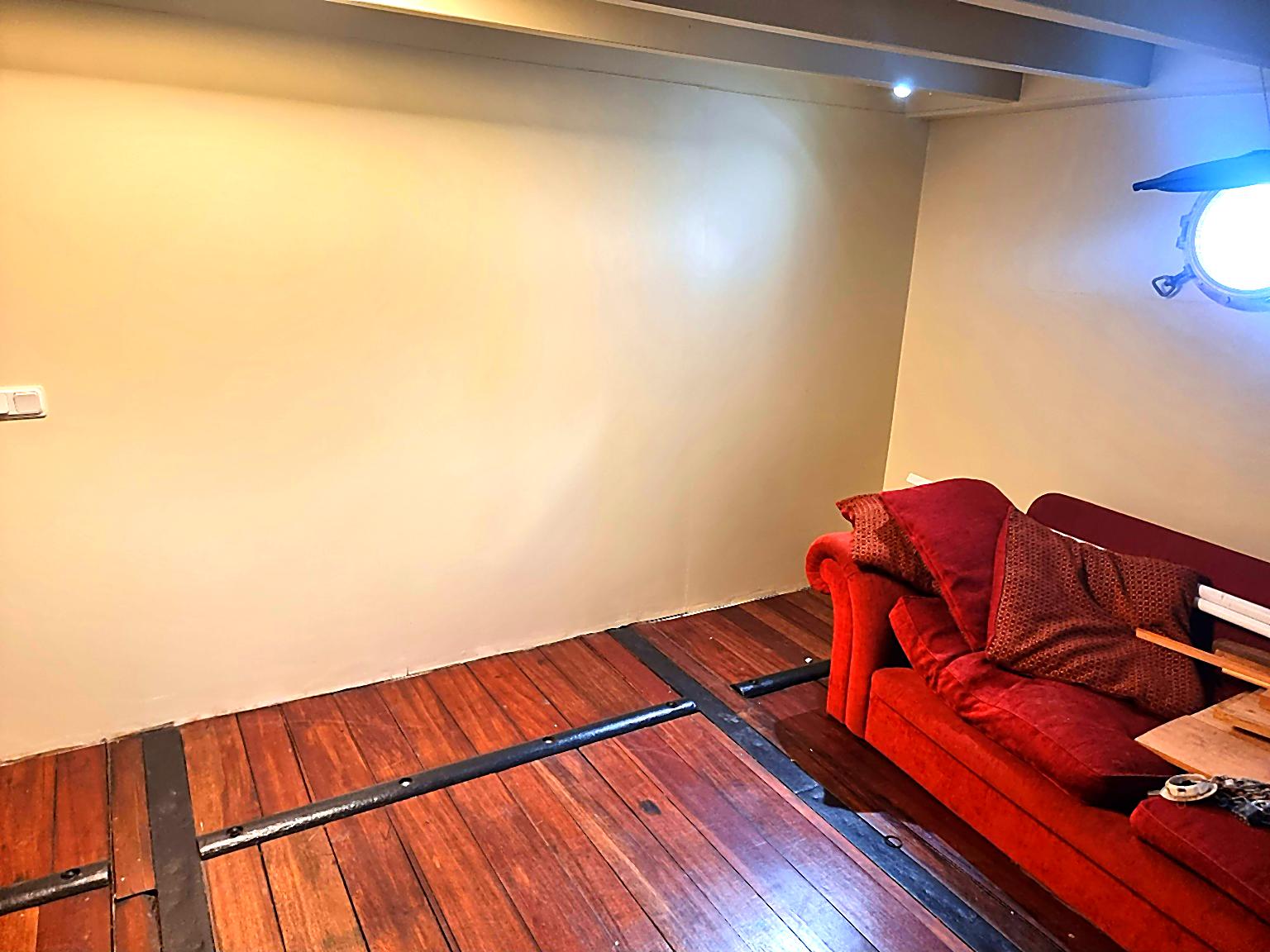 The former hold has oiled, hardwood flooring, polished brass portholes, and is newly decorated with F&B paint.