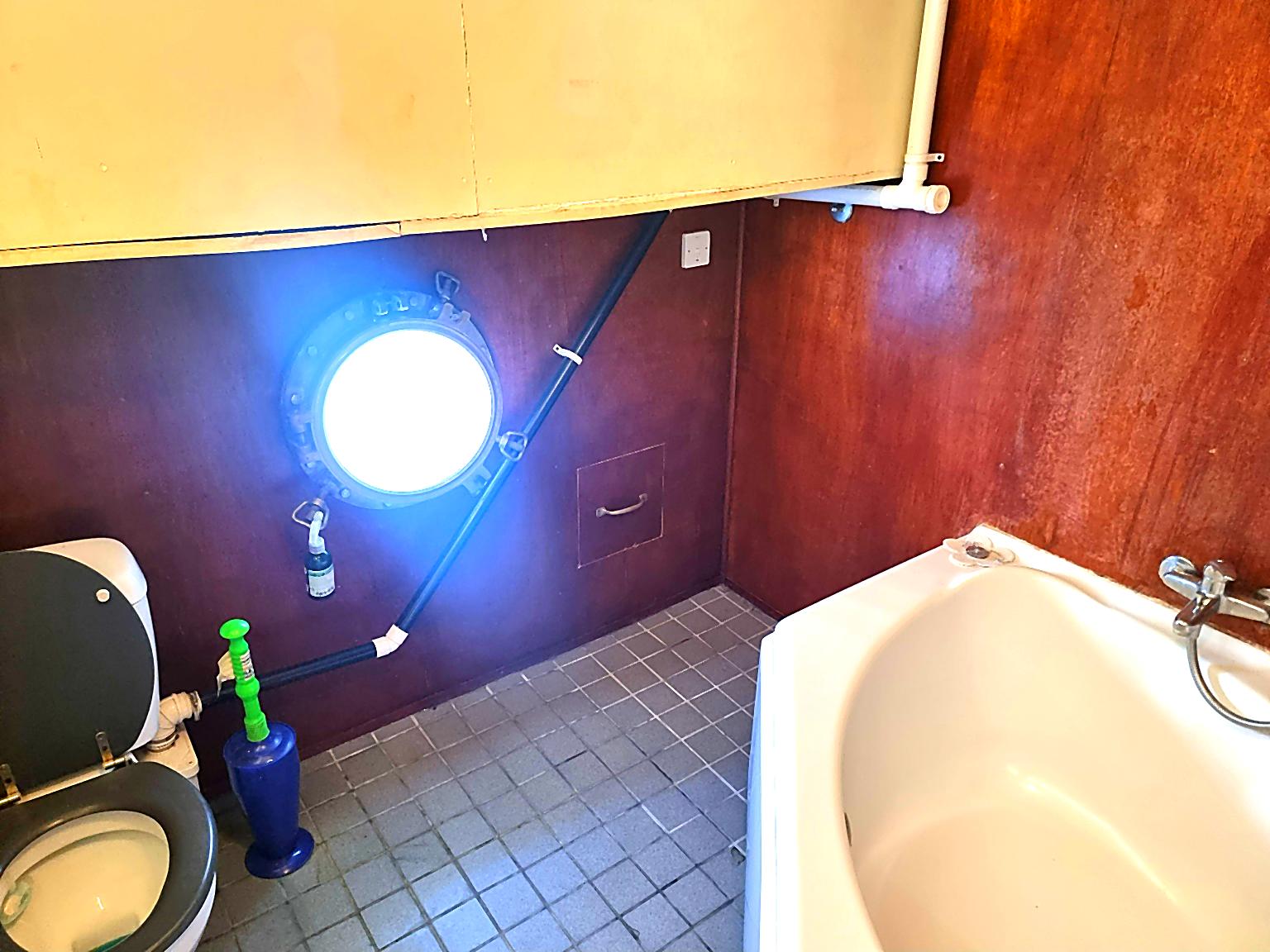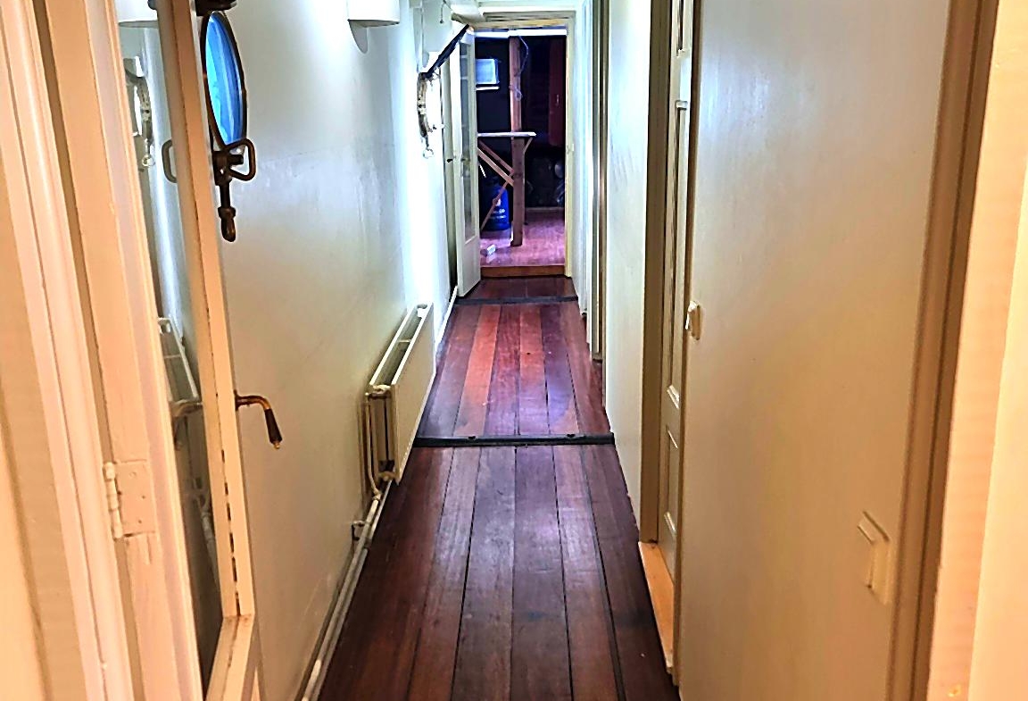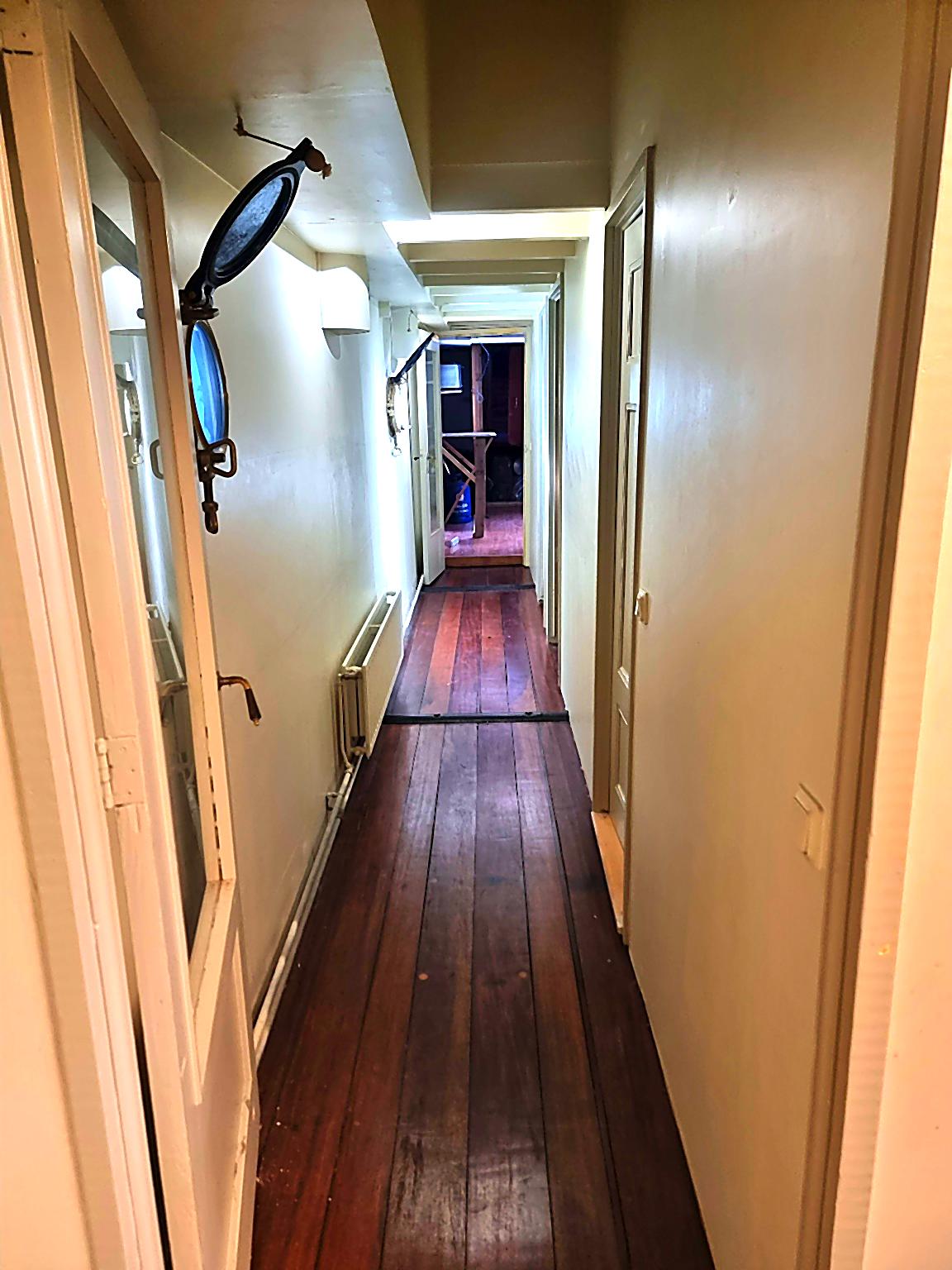 The former hold has oiled, hardwood flooring, polished brass portholes, and is newly decorated with F&B paint.