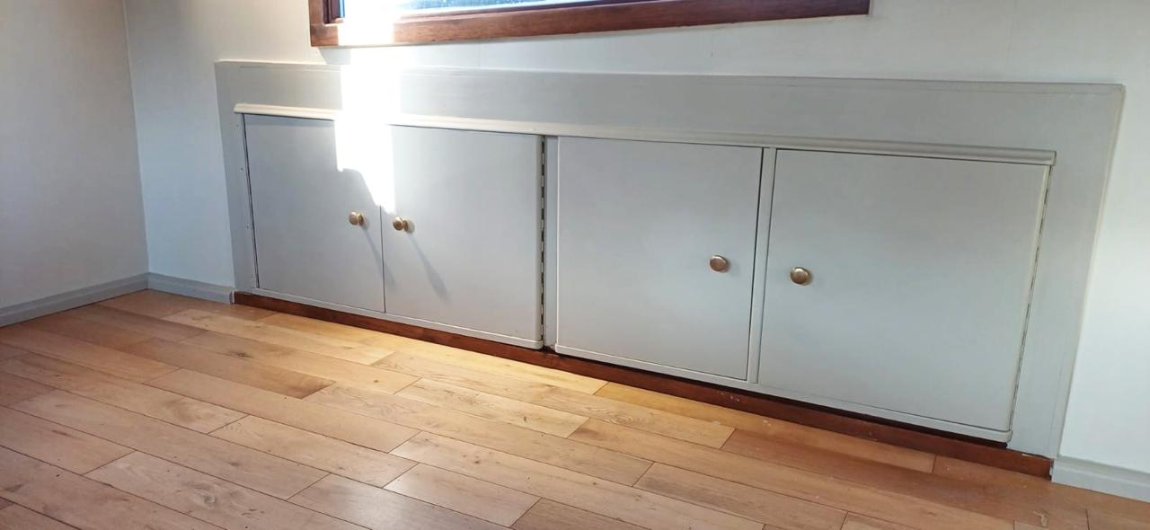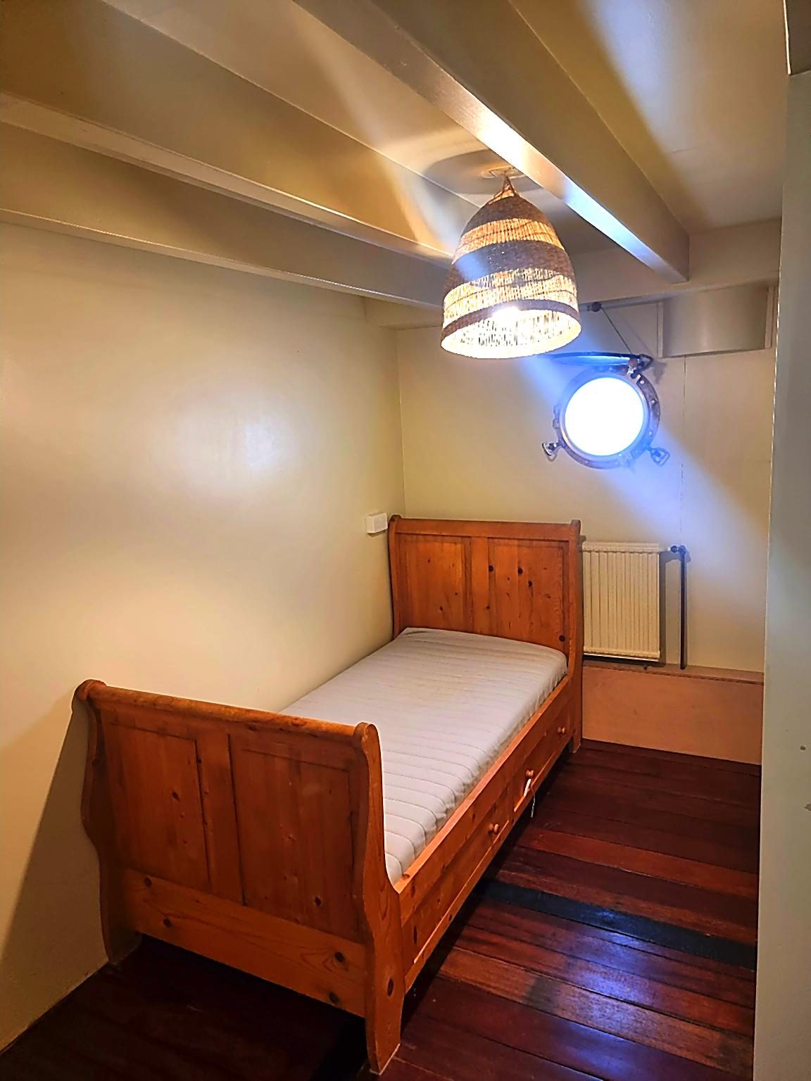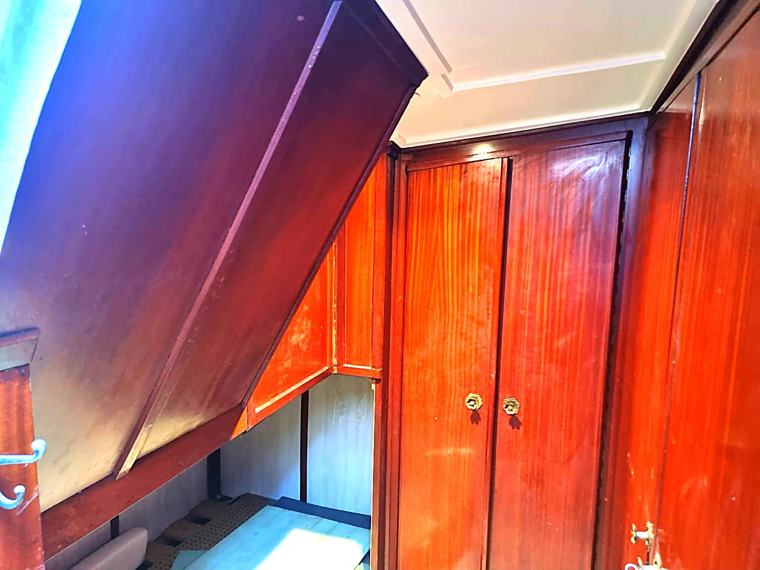– bedroom 1: former skippers’ quarters. Built-in bed (small double), lots of wardrobes (both hanging and shelved storage), and comfortable space for a desk/work area.