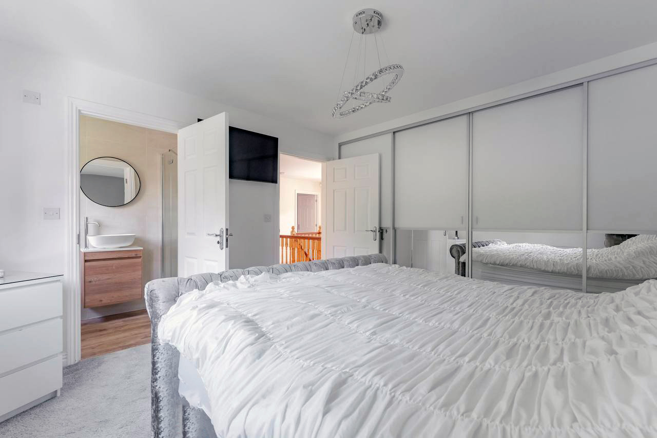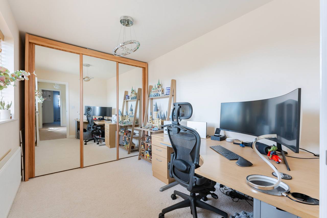 Climb the oak staircase to a roomy landing – wide enough to future-proof, whilst the huge loft is fitted with dormer trusses, floor laid and is ripe for conversion. Four double bedrooms branch off like points on a compass, each granting privacy to its occupant. The principal suite is filled with the afternoon western light, fitted wardrobes, and a recently refurbished en-suite shower room. The family bathroom – upgraded, distinctive, indulgent – serves the rest with flair. Linen and towels disappear into a deep storage cupboard tucked neatly off the landing.