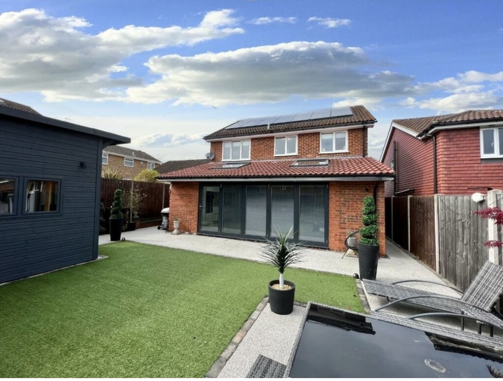 Exceptional 5-bedroom detached family residence in desirable Bearsted. Boasts solar panels (earning over £1k annually), underfloor heating, flowing open plan layout, stunning 5m Origin bifold doors, dedicated gym/home office, and a spacious driveway. The entrance hall, featuring marble-effect porcelain tiles, guides you past the 5th bedroom/playroom into a remarkable extension showcasing premium open plan living. The front-facing living room features a custom TV media wall, while the rear houses the kitchen/diner and W.C. The kitchen is equipped with integrated Neff ovens and a Bosch dishwasher, a central island with LED underlights, and a large extractor with LED lighting above the 5-ring induction hob. Remote-controlled rain-sensor Velux windows fill the space with natural light – a true heart of the home for entertaining. The 5m Origin bifold doors (with integrated blinds) open to a low-maintenance garden with resin patio areas, perfect for outdoor gatherings. An external outbuilding with LED spotlights currently serves as a gym but is ideal for a home office. The first floor landing leads to the family bathroom and four further double bedrooms, one with built-in wardrobes, and the master suite which includes an en-suite bathroom and a built-in wardrobe. Conveniently located with easy access to London and the coast via an 8-minute walk to the train station or by motorway. Situated within the catchment area for the highly-rated Thurnham & Roseacre Junior & Saint John’s Primary schools. The charming village green, offering a selection of excellent pubs and restaurants, is a short 9-minute walk away. Leisure amenities include Bearsted Golf Club, bowling and tennis clubs, nearby leisure centres, and the beautiful grounds of Leeds Castle and Mote Park are easily accessible.