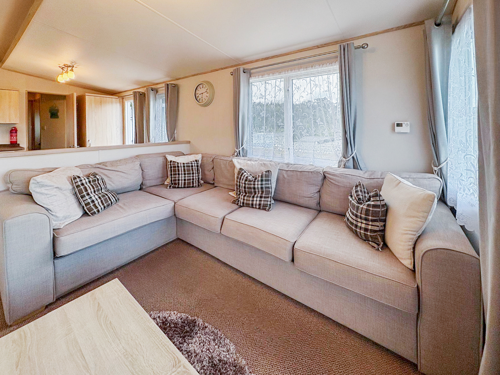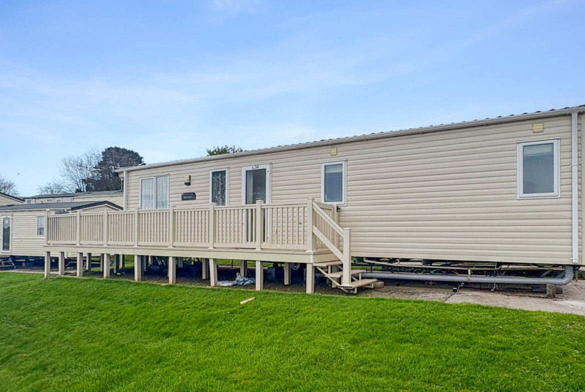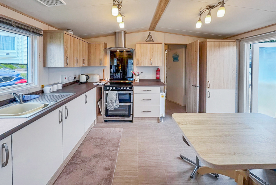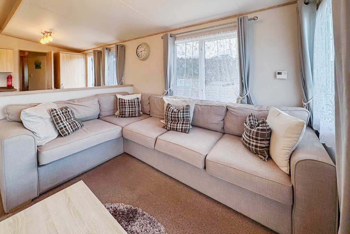 This 2-bedroom ABI Blenheim combines comfort and practicality with its light-filled, open-plan layout and stylish interiors. The living area includes a large wraparound sofa (with sofa bed), built-in electric fire and freestanding dining furniture. The kitchen is well-equipped with integrated appliances and plenty of storage space — ideal for both short stays and longer visits.