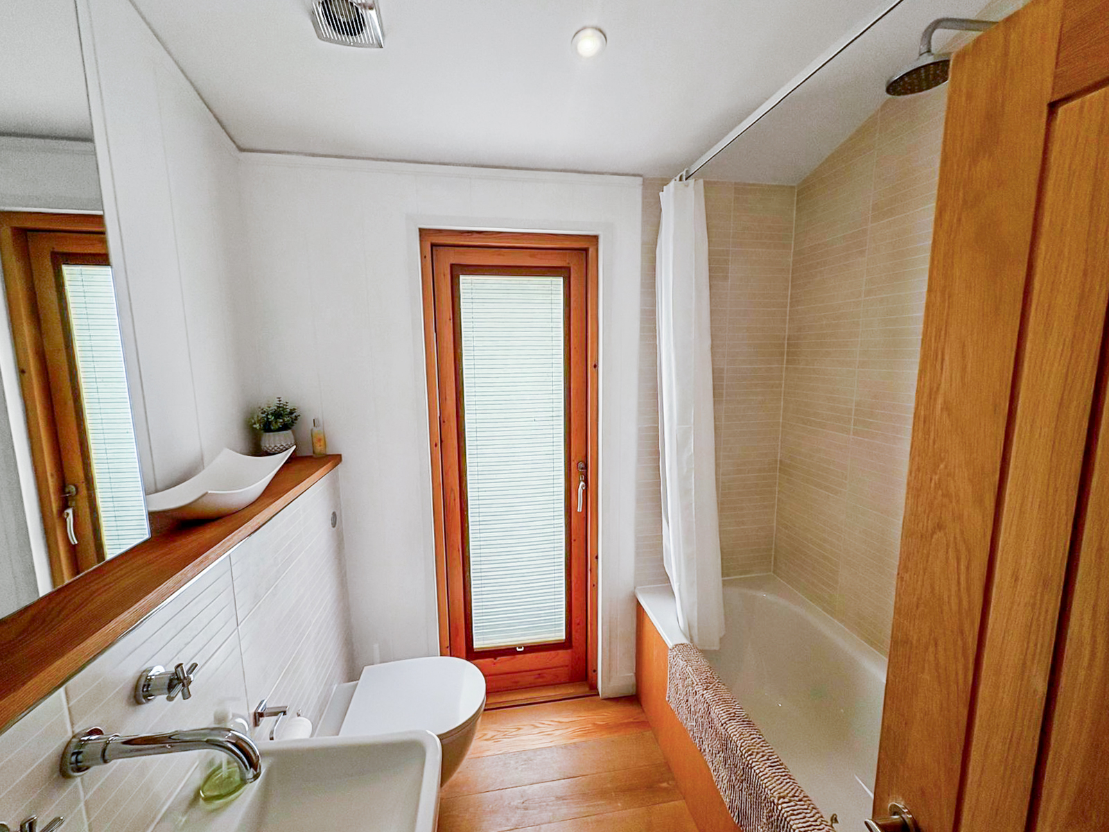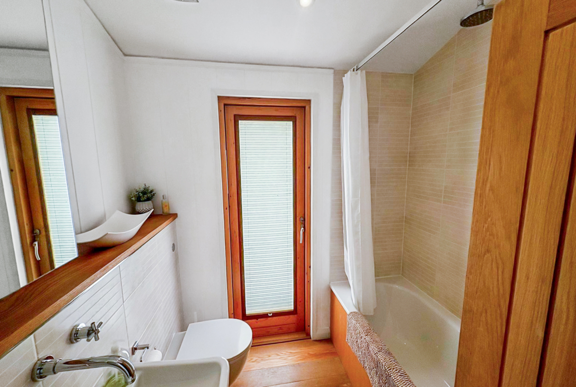 The open-plan living area features vaulted ceilings, oak flooring, and glass doors in all rooms, allowing for maximum light and airflow. The generous en-suite to the master bedroom boasts a double shower cubicle, while two further double bedrooms provide plenty of space for family and guests.